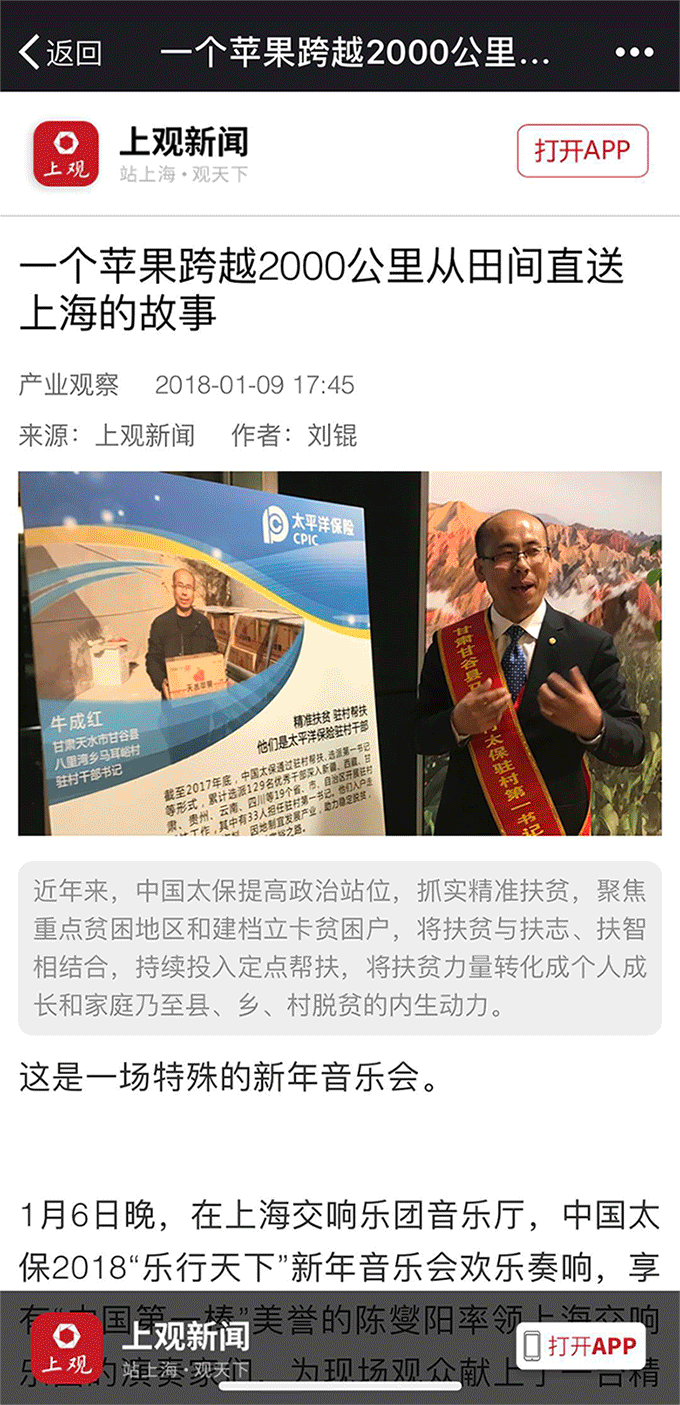 馬耳峪村是保哥家壽險(xiǎn)甘肅分公司的對(duì)口扶貧點(diǎn),蘋果是當(dāng)?shù)亟n立卡戶的主要收入來源。這里的蘋果色澤鮮艷,個(gè)大形正,各項(xiàng)理化指標(biāo)均達(dá)到或超過國內(nèi)優(yōu)質(zhì)蘋果標(biāo)準(zhǔn),但因受制于交通及信息不暢,蘋果銷售遇到困難,愁煞了辛苦的農(nóng)民。在保哥家的幫助下,村里建起蘋果銷售微店,通過音樂會(huì)現(xiàn)場(chǎng)積極推廣二維碼,觀眾掃碼在線下單了373箱扶貧蘋果,一共3700多斤,打響了馬耳峪蘋果走出大山的第一炮。